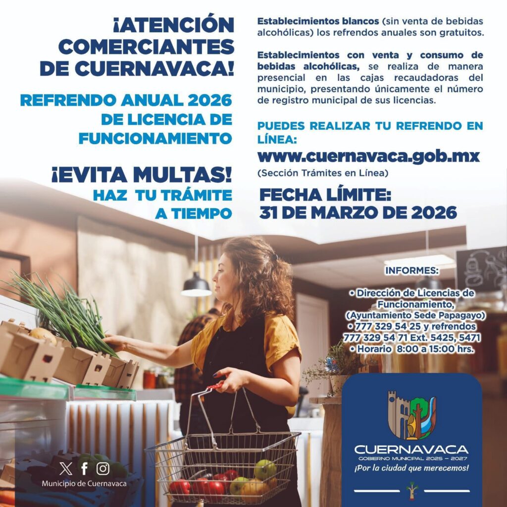 El Ayuntamiento de Cuernavaca, a través de la Secretaría de Desarrollo Económico y Turismo (SDEyT), emitió un exhorto a los propietarios de establecimientos comerciales para realizar el refrendo de sus licencias de funcionamiento 2026. La fecha límite para cumplir con esta obligación es el próximo 31 de marzo.