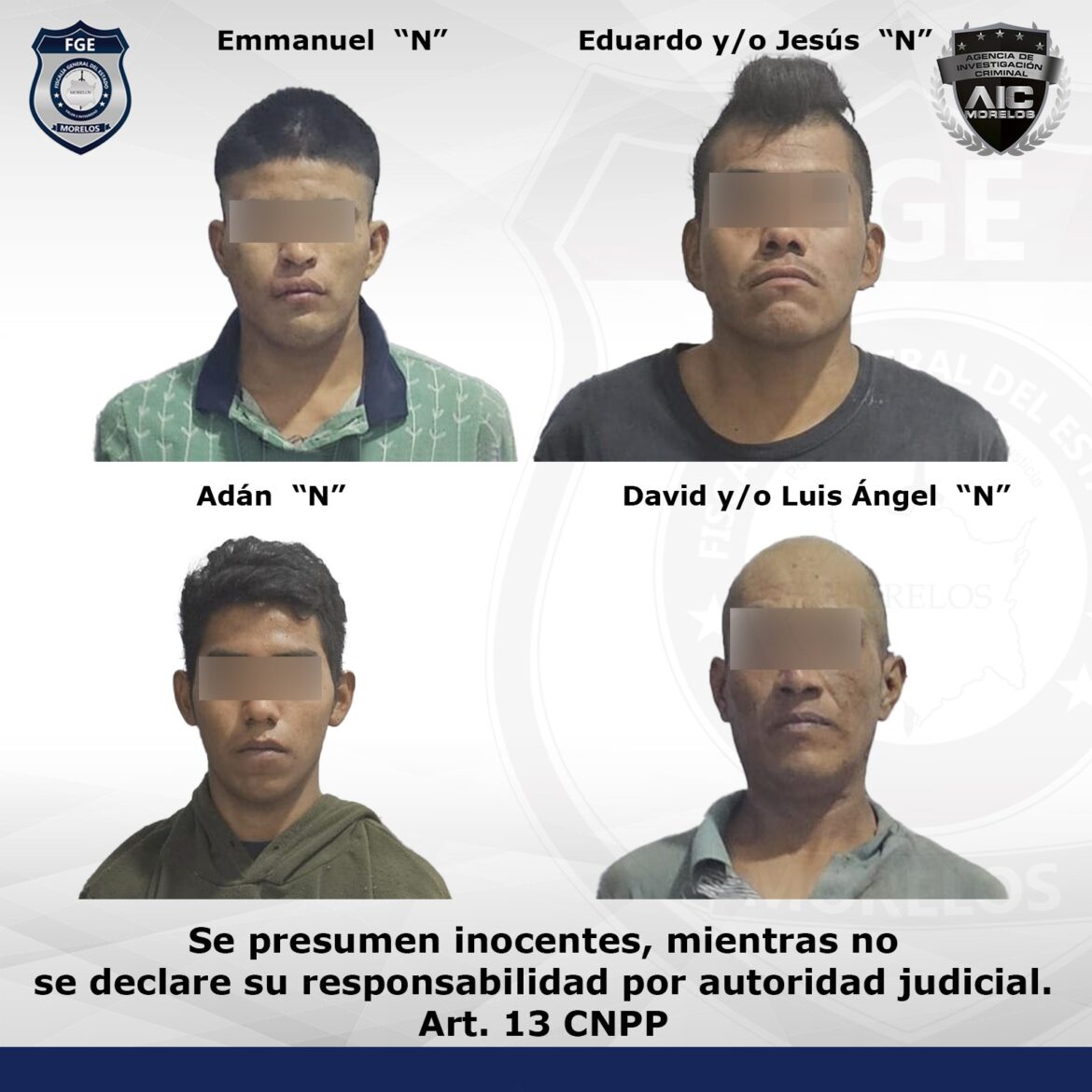 Las personas son citadas en este comunicado de acuerdo a lo marcado por el artículo 13 del Código Nacional de Procedimientos Penales, que dice: “Toda persona se presume inocente y será tratada como tal en todas las etapas del procedimiento, mientras no se declare su responsabilidad mediante sentencia emitida por el Órgano jurisdiccional”.
