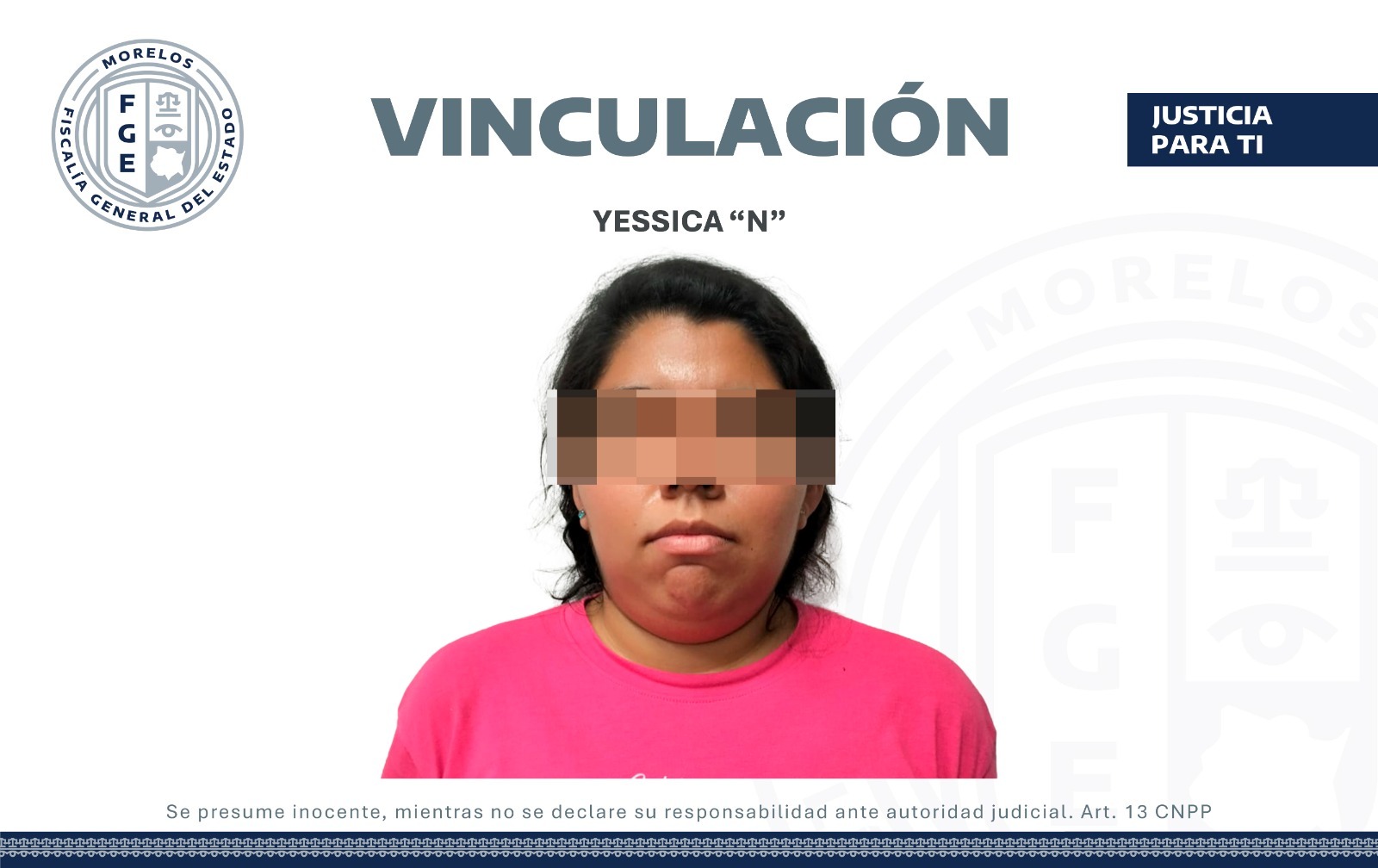 Las personas son citadas en este comunicado de acuerdo a lo marcado por el artículo 13 del Código Nacional de Procedimientos Penales, que dice: “Toda persona se presume inocente y será tratada como tal en todas las etapas del procedimiento, mientras no se declare su responsabilidad mediante sentencia emitida por el Órgano jurisdiccional”.